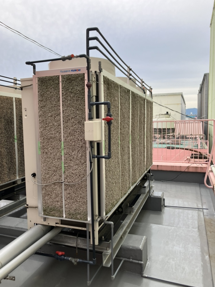 間接散水冷却方式により、夏場の高温時でも吸い込み空気温度を低下させることができ、冷凍能力の向上や老朽化した機器の運転効率改善が得られます。また、アルミフィンを直接水に触れさせない冷却方式のため、腐食やスケールの付着を防ぎ、機器の寿命延長にも寄与します。